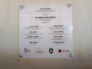 Il aura fallu attendre ce lundi 6 octobre 2025, la première rentrée scolaire datant de septembre 2024, pour que le collège de Lussac soit enfin inauguré. De nombreuses personnalités politiques et académiques étaient présentes. Sous un soleil ardent les collégiens ont entamé une chorégraphie bien orchestrée avant de brandir chacun de petits papiers colorés sur lesquels était inscrit le simple mot « MERCI ». Puis, à l’intérieur des murs fut dévoilé la plaque en hommage à Lucie Aubrac, cette résistante qui donne désormais son nom au collège. Une seconde plaque fut révélée, celle présentant une fresque de Mme Talon, professeure d’arts plastique. Une exposition présentant le collège de ses origines à nos jours était présentée dans la salle d’arts plastique. Enfin, une capsule temporelle contenant des messages et mots des élèves et personnel du collège fut enfouie avant que chacun puisse se retrouver auprès d’un verre de l’amitié.